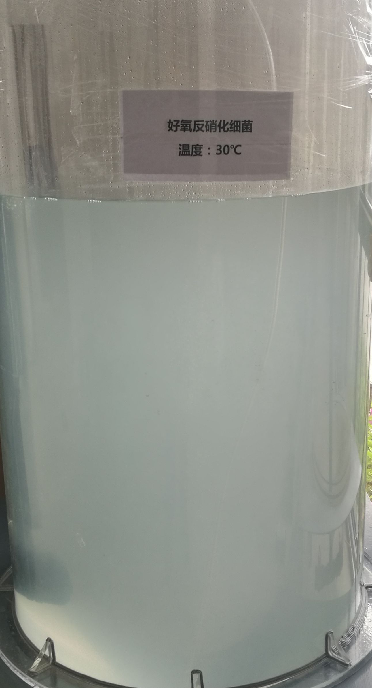 3、將混勻后的菌液置于光生物反應(yīng)器培養(yǎng),溫度:30~35℃,循環(huán)水泵和氣泵均24h運(yùn)轉(zhuǎn),培養(yǎng)2-5天,即可,培養(yǎng)成功的好養(yǎng)反硝化細(xì)菌顏色呈白色或微黃,有泡沫。