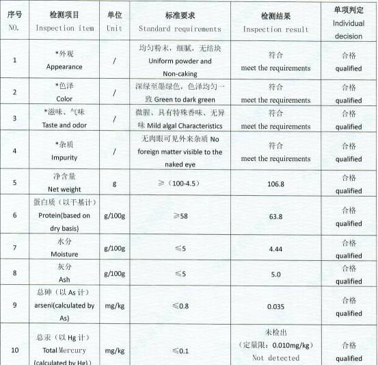 光語食用級(jí)別純度蛋白核小球藻藻粉檢測報(bào)告