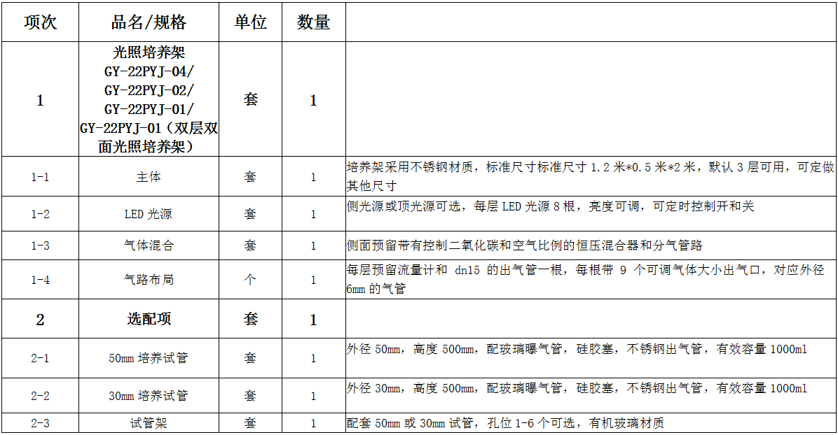 1、培養(yǎng)試管,石英玻璃材質,直徑30mm或者50mm,高度600mm,對應容量500ml或者1000ml,配套耐高溫硅膠和0.9mm內徑的毛細曝氣管一根