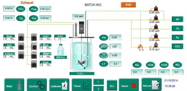 顯示并記錄發(fā)酵時(shí)間、溫度、pH、溶解氧、轉(zhuǎn)速、空氣流量、?壓力、補(bǔ)料量、泡敵量、酸堿劑量等發(fā)酵過(guò)程參數(shù),包括實(shí)時(shí)動(dòng)態(tài)曲線圖均可查看: