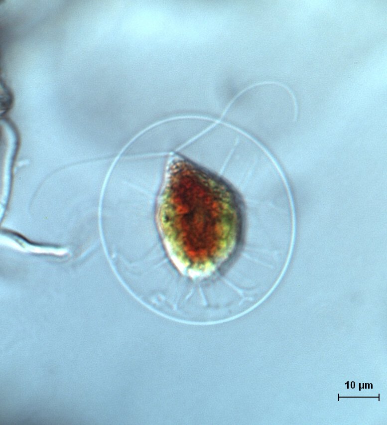幾年后,Peebles(1901a,1909b)發(fā)表了這種藻的生長史,更為詳細的描述了“haematochrom”在整個生命周期過程中的變化。1934年,Elliot從細胞形態(tài)學(xué)的角度補充了這種藻類的生長史的細節(jié)。在整個生命周期中出現(xiàn)四種典型的細胞形態(tài):小蟲體、長有鞭毛的大蟲體、沒有運動能力的膠鞘體、帶有堅硬細胞壁的紅色大細胞——紅孢囊(haematocysts)。在有充足營養(yǎng)的清潔環(huán)境中,大蟲體占主導(dǎo)地位;一旦環(huán)境惡化就會轉(zhuǎn)化為叫膠鞘體,之后轉(zhuǎn)化為具有抵抗力的紅孢囊,并開始積累蝦青素。隨后,當(dāng)周圍的環(huán)境又變得營養(yǎng)充足適宜的時候,紅孢囊變成可運動的小蟲體,這些小蟲體長成膠鞘體或者大蟲體。