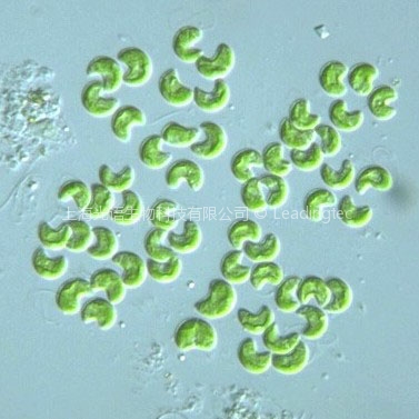 群體球形 ,由 4個細胞為一組包被在膠質的群體膠被中,直徑 30m。細胞在一個平面上彎曲呈馬蹄形,兩端略細,不尖銳,缺口為 u型 ,長8m,寬 5m。色素體 1個 ,片狀 ,除凹側 中部以外充滿整個細胞 ;具 1個蛋白棱