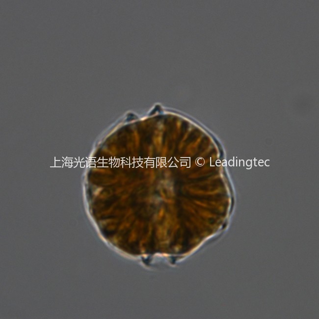 細胞球形,長略大于寬。細胞長20-42μm,寬18-40μm。上殼與下殼半球形,大小相近。上殼兩肩突起;下殼兩側不對稱,右半邊比左半邊短。細胞上、下兩端都無刺或突起,下端微凹陷。橫溝深,中央位,橫溝彎曲下行的長度和橫溝寬度相等。縱溝深,后部寬,甲片薄。此種常形成有毒赤潮。