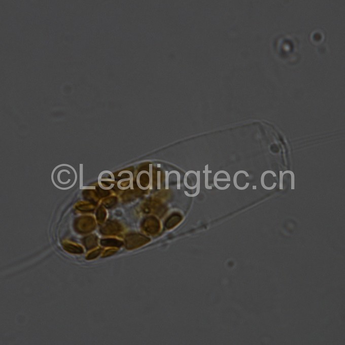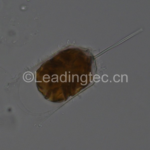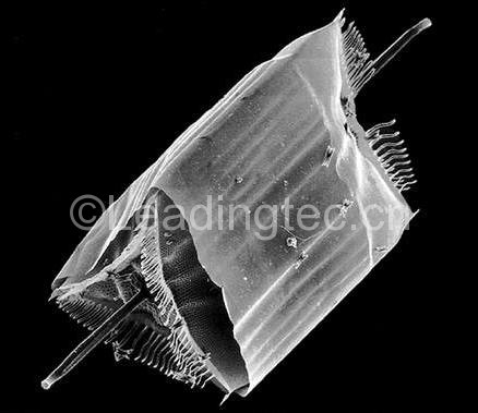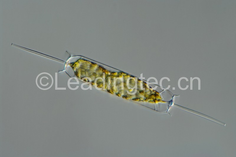 單細胞,形狀為三角柱形,近于圓柱形或方柱形。細胞寬25-60微米,高98-190微米,通常高為寬的2-3倍或更長。殼面扁平,大多為三角形,中央有中空的大刺。細胞壁薄,色素體多數(shù),呈顆粒狀,同時,藻細胞獨立生活不會連接成串,細胞中綠色的小點是它的葉綠體。布氏雙尾藻適溫范圍廣,屬世界性種類,也是我國沿海常見中之一。我國四大海區(qū)均有記錄。