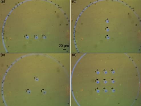 此次獲Lab on a Chip封面刊載的論文,論述了微納米課題組在前期控制藻類細(xì)胞沿任意設(shè)定路線游動的基礎(chǔ)上,進(jìn)一步實現(xiàn)了藻類細(xì)胞的陣列化旋轉(zhuǎn)。結(jié)合光誘導(dǎo)介電泳技術(shù)(ODEP),建立了藻類細(xì)胞在ODEP微環(huán)境中的轉(zhuǎn)動狀態(tài)模型和受力模型,實現(xiàn)了對藻類細(xì)胞的快速捕獲及陣列化旋轉(zhuǎn),且通過改變光強可有效調(diào)節(jié)細(xì)胞旋轉(zhuǎn)速度。構(gòu)建的藻類細(xì)胞旋轉(zhuǎn)陣列有望作為微尺度馬達(dá)陣列,在微流控及生物驅(qū)動領(lǐng)域發(fā)揮重要作用。
