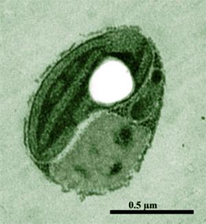 圖11. 綠色游藻,個頭小,不到一微米直徑,年代久遠(yuǎn),印象中是第一個被破獲基因組的微藻種類(這個照片是藻被切成了片了,藻也逃不過被切片的命啊,呵呵)。