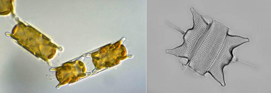 圖13.三角褐指藻,這個藻在水產(chǎn)養(yǎng)殖中經(jīng)常用,尤其是用來養(yǎng)蝦苗貝苗等,名字里帶了三角兩字,不過它也經(jīng)常有不是三角的模樣,梭狀、卵圓形都有。