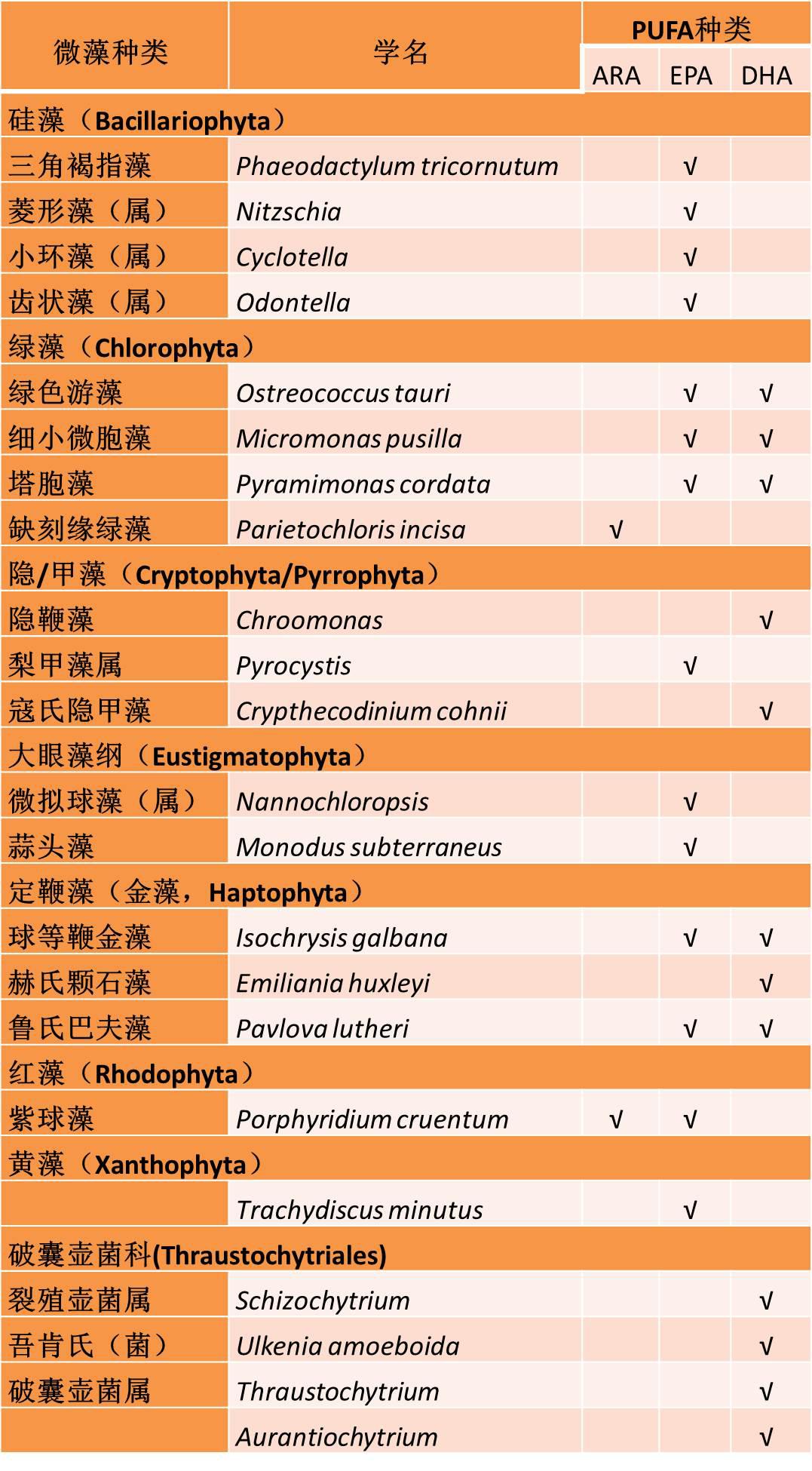 老俞先列一個大表,羅列下產(chǎn)PUFA的微藻(僅列出ARA、EPA和DHA三種PUFA)