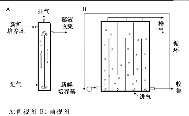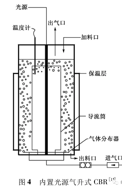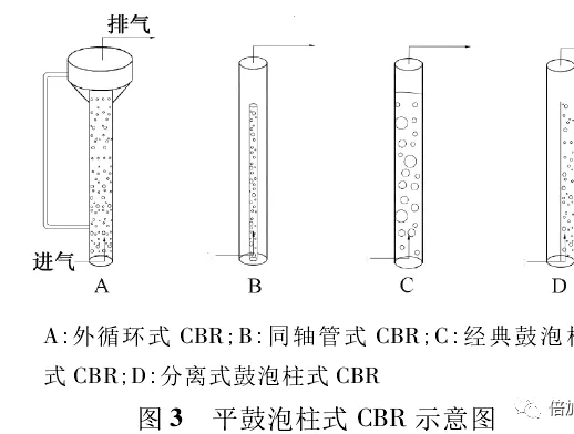 ? ? ? ? CBR由柱體、供氣裝置、控溫裝置、光源等組成。其中,柱體材料由透明玻璃或塑料制成;所供氣體由底部進(jìn)入,頂部排出;光源設(shè)置在柱體內(nèi)部或外部(可使用太陽(yáng)光),內(nèi)置光源雖然效率高但不易清洗,應(yīng)用受到限制。按進(jìn)氣模式分類(lèi)有鼓泡式CBR(圖3)和氣升式CBR 2種,其中鼓泡式有同軸管式、分隔柱式、分離式和外循環(huán)式等類(lèi)型[00;氣升式反應(yīng)器內(nèi)部分成上升區(qū)和下降區(qū)2個(gè)部分,氣體由上升區(qū)底部進(jìn)入,因此底部培養(yǎng)液含氣率大、密度小,氣體就會(huì)自動(dòng)上升到頂部,頂部的空間較大,氣體逸散后從排氣口排出,此時(shí)的培養(yǎng)液含氣率降低、密度變大,氣體就會(huì)從下降區(qū)流回至上升區(qū)底部而形成循環(huán)