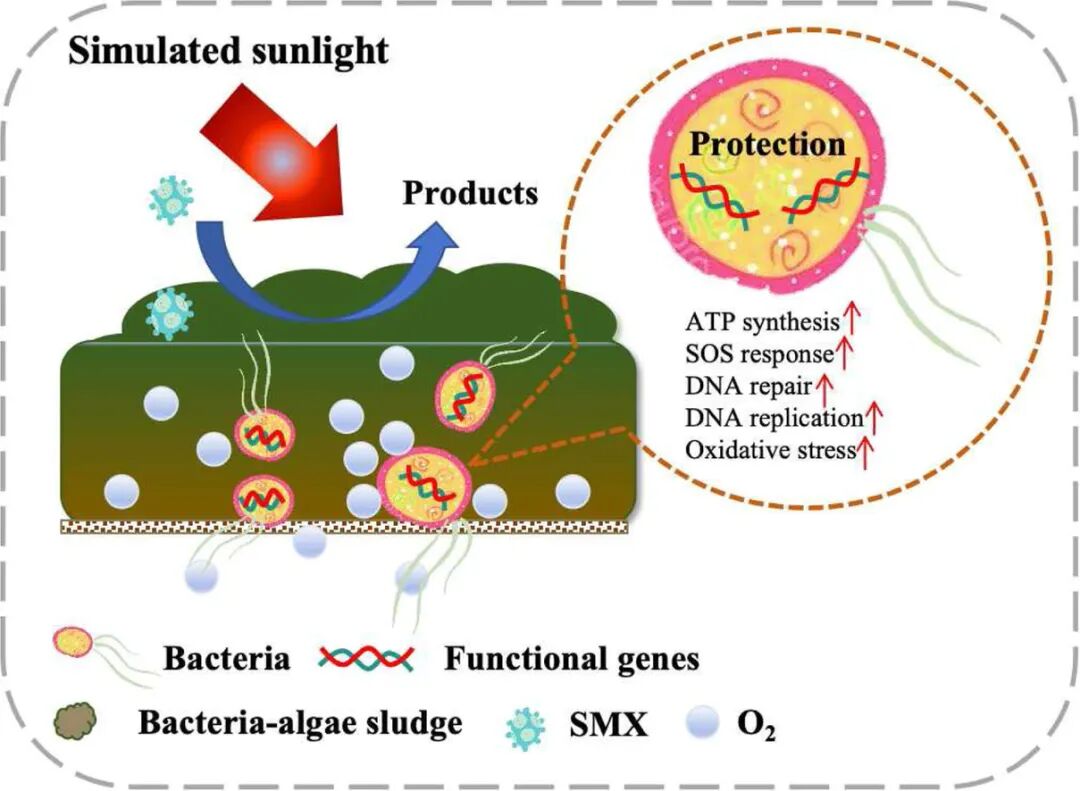 藻類活動(dòng)對維持生物膜健康結(jié)構(gòu)至關(guān)重要。在模擬日光壓力下,UV-MABAR系統(tǒng)中的藻類有效緩解了輻照誘導(dǎo)的細(xì)菌蛋白質(zhì)二級結(jié)構(gòu)變化,即抑制了α-螺旋向(β-折疊+無規(guī)卷曲)的構(gòu)象轉(zhuǎn)變,從而減弱了生物膜基質(zhì)的過度壓實(shí),有利于物質(zhì)傳輸和代謝活動(dòng)。更為關(guān)鍵的是,藻類的增殖上調(diào)了細(xì)菌中負(fù)責(zé)DNA損傷修復(fù)的關(guān)鍵基因recA的表達(dá)(增加1.7倍)。這種上調(diào)不僅保障了細(xì)菌基因組尤其是負(fù)責(zé)SMX等污染物分解代謝的功能基因簇的完整性,防止了因DNA損傷導(dǎo)致的內(nèi)源性物質(zhì)釋放和細(xì)胞裂解,也間接維護(hù)了生物膜整體的代謝功能和群落穩(wěn)定性。