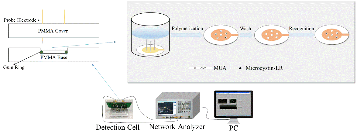 最近,蘇州醫(yī)工所微納技術研究室周連群團隊開發(fā)出一種結(jié)合了壓電技術和分子印跡技術的微囊藻毒素LR生物傳感器,并正在研發(fā)基于壓電技術的微囊藻毒素檢測系統(tǒng)。該團隊在20 MHz的石英微天平芯片上面通過分子自組裝及原位合成的技術修飾了針對微囊藻毒素LR特異性識別的多孔分子印跡膜。當檢測樣品中存在微囊藻毒素LR時,微囊藻毒素LR分子將被特異性吸附到壓電芯片表面分子印跡膜內(nèi),壓電芯片表面產(chǎn)生質(zhì)量變化,通過檢測壓電芯片的頻率變化來檢測微囊藻毒素LR分子吸附量。該傳感器的檢測限為0.04 nM,擁有良好的特異性,可重復性使用,并可用于實際湖水樣本中微囊藻毒素LR的檢測。