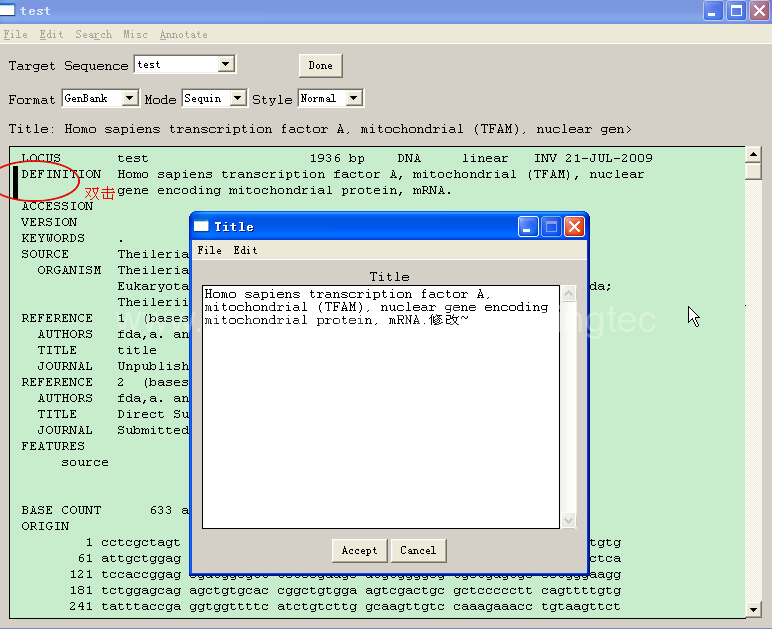 上面的步驟都完了之后。出現(xiàn)一個(gè)GenBank格式的界面,如下圖。在這里,一切信息就一目了然。那里不對,需要修改的。雙擊就行了。另外,在Edit菜單比較修改作者、聯(lián)系方式等資料。