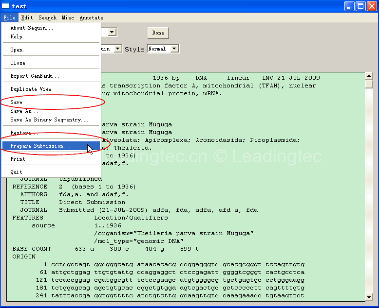 如果在中途要臨時(shí)保存,在File菜單的Save,保存后的文件是.sqn。全部修改完畢后,選擇File/Submission。就會有一個(gè)提示框,提示把保存后的發(fā)送一封郵件到NCBI。