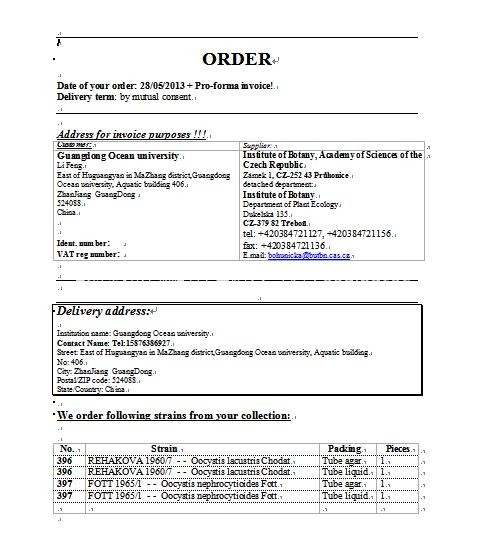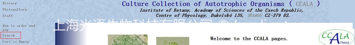 捷克藻種庫,全稱為Culture?Collection?of?Autotrophic?Organisms(CCALA),是捷克科學(xué)院植物研究所下屬的一個(gè)機(jī)構(gòu),官方網(wǎng)址為:http://ccala.butbn.cas.cz/index.php。藻種價(jià)格上相對比較便宜一點(diǎn),如果用于科學(xué)研究會打半折(注意,捷克是用歐元進(jìn)行結(jié)算的)。下面我以購買卵囊藻(Oocystis)為例,介紹一下主要的購買流程: