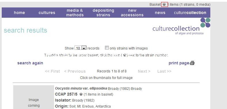 點(diǎn)擊Search,進(jìn)入搜索結(jié)果界面,這時(shí)你可以看見藻種編號及藻種,在藻種圖片的上訪有一個(gè)購物車(紅色框)的圖標(biāo),點(diǎn)擊它購買藻種,如圖: