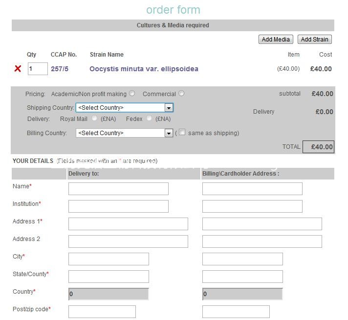 與捷克藻種庫要求差不多,這里就不贅述了,填寫完成后點(diǎn)擊頁面下方的Send,將訂購信息發(fā)給CCAP,注意CCAP是用英鎊結(jié)算的。
