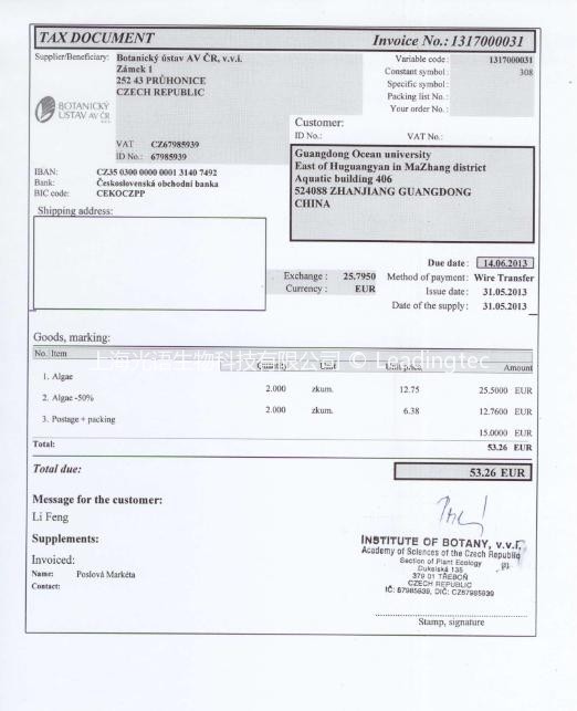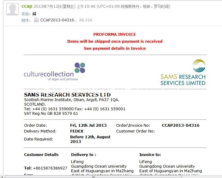 匯款方式,前面已經(jīng)介紹過了,這里提一下與捷克藻種庫不同的是,CCAP發(fā)的是聯(lián)邦快遞,聯(lián)邦快遞比較貴,同時(shí)需要注意的是關(guān)稅問題,關(guān)稅如何收取的,超過多少錢收關(guān)稅,這個(gè)我沒有去找資料,我的個(gè)人經(jīng)歷是,從捷克藻種庫購買的藻種沒有交付關(guān)稅,而從CCAP購買的藻種除了付了購藻的錢,我拿到貨物之后又付了300多人民幣的關(guān)稅,原因很可能是我在CCAP購買的藻種較多,價(jià)錢超過了一定額度,但是我沒有去考證。。