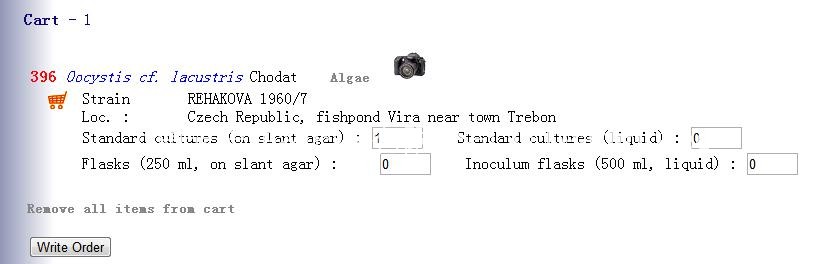點(diǎn)擊目錄欄的Order,查看你的購物車,顯示你要購買的藻種的一些信息,如圖: