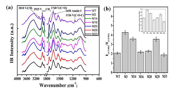 圖1:(a)雨生紅球藻不同突變?cè)逯甑募t外光譜;(b)紅外光譜吸收強(qiáng)度比值I(1740)/I(1156)光譜強(qiáng)度比值與蝦青素含量的關(guān)系