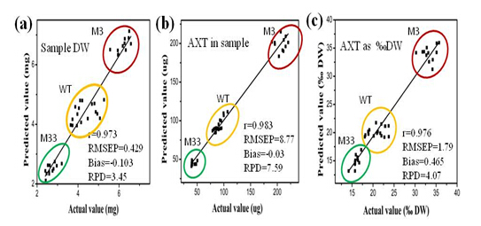 此外,黃青研究組還探索了對(duì)藻株群體細(xì)胞的近紅外光譜(NIRS:near-infrared spectroscopy)篩選方法。他們把群體藻株的近紅外光譜并結(jié)合生化檢測(cè)建立了基于偏最小二乘(PLS)的生物量、蝦青素含量及蝦青素在藻細(xì)胞的干重的百分含量的預(yù)測(cè)模型,由此可以對(duì)蝦青素不同產(chǎn)量的雨生紅球藻突變株進(jìn)行預(yù)測(cè),獲得較高的預(yù)測(cè)準(zhǔn)確率。這項(xiàng)工作發(fā)表于Letters in Applied Microbiology。