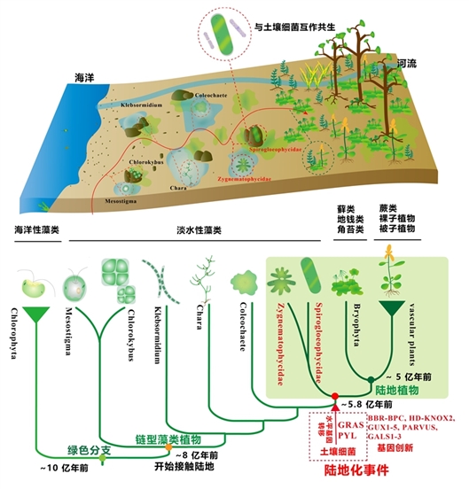 中國(guó)農(nóng)科院基因組所研究員程時(shí)鋒團(tuán)隊(duì)與來(lái)自德國(guó)、加拿大、俄羅斯的科學(xué)家,聯(lián)合證明了一個(gè)新發(fā)現(xiàn)的雙星藻綱單細(xì)胞綠藻Spirogloea muscicola,是所有陸地植物最近緣的共同祖先。之前被認(rèn)為是陸地植物才有的很多轉(zhuǎn)錄因子,在該綠藻基因組上都能找到其祖先起源的“根”。論文報(bào)道了陸地植物共同的祖先在5億年前突破干旱適應(yīng)成功登陸的分子機(jī)制,并首次揭示陸地植物祖先“借用”土壤細(xì)菌基因的遺傳物質(zhì)創(chuàng)新以驅(qū)動(dòng)漫長(zhǎng)的陸地化進(jìn)程。