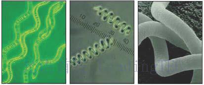 螺旋藻屬藍(lán)藻門(Cyanophyta),藍(lán)藻綱(Cyanophyceae),顫藻目(Osillatoriales),顫藻科(Oscillatoriaceae?)節(jié)旋藻屬(Arthrospira?),因早期誤分類為螺旋藻屬(Spirulina),而后約定成俗稱為螺旋藻。細(xì)胞無色素體,色素分布在原生質(zhì)外部,無細(xì)胞核。絲狀,行二分裂無性繁殖,繁殖結(jié)果使藻絲長度迅速增加。無有性生殖。生態(tài)條件:螺旋藻原生活在堿性水中,可以在淡水中培養(yǎng),也可通過逐步馴化適應(yīng)在海水中生長,直到海水鹽度達(dá)到35也不產(chǎn)生藻體凝聚現(xiàn)象。常見養(yǎng)殖品種為鈍頂螺旋藻(A. platensis)和極大螺旋藻(A. maxima?)。