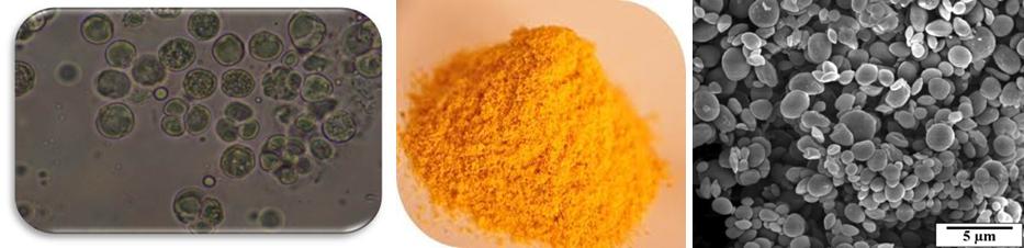 雨生紅球藻 (Haematococcus pluvialis)是一種單細(xì)胞淡水綠藻,屬于綠藻門(Chlorophata)、綠藻綱(( hlorophyceae)、 團(tuán)藻目(Volvocales)、紅球藻科(Haematococcaccae)、紅球藻屬(Haematococcus)。雨生紅球藻在多種不適宜生長的外界環(huán)境條件下會(huì)在細(xì)胞核周圍的細(xì)胞質(zhì)基質(zhì)中加速積累次生類胡蘿卜素,其中80%以上為蝦青素(圖1-2)及其酯衍生物。研究證明,蝦青素的抗氧化活性比β-胡蘿卜素、玉米黃素、葉黃素和角黃素等類胡蘿卜素高10倍,比黃體素高200倍,比維生素E高550倍被稱為超級維生素E。