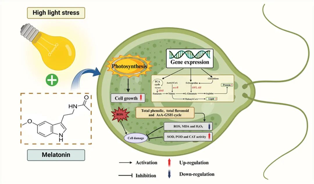機制探究表明,外源性褪黑素的施加有效緩解了強光脅迫對萊茵衣藻造成的光損傷,一方面通過增強機體抗氧化能力抑制氧化應激反應,為細胞生長提供穩(wěn)定內(nèi)環(huán)境;另一方面通過調(diào)控代謝通路,促進初級與次級代謝物的有序積累。分子層面上,外源性褪黑素不僅能夠顯著上調(diào)萊茵衣藻體內(nèi)關(guān)鍵生物合成酶的表達水平,還可激活內(nèi)源性褪黑素的生物合成通路,形成“外源性補充-內(nèi)源性激活”的協(xié)同調(diào)控效應,進一步強化其抗逆能力與代謝調(diào)控作用。
