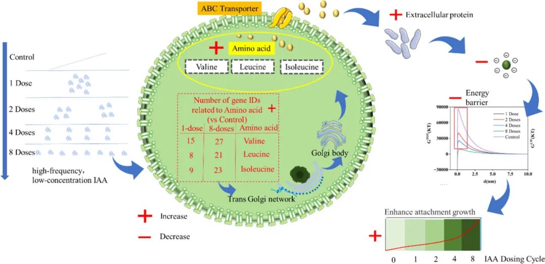 為揭示其內(nèi)在機(jī)制,研究者進(jìn)一步開(kāi)展轉(zhuǎn)錄組分析,結(jié)果表明高頻低劑量IAA刺激可顯著上調(diào)小球藻中疏水性氨基酸(如亮氨酸、異亮氨酸)的合成通路基因。疏水性氨基酸的增加能夠提升細(xì)胞表面疏水性,增強(qiáng)微藻細(xì)胞與載體間的相互作用,從而加速生物膜的附著與穩(wěn)定。? 該研究不僅闡明了重復(fù)低劑量IAA刺激調(diào)控微藻生物膜附著的規(guī)律與分子機(jī)制,更為工業(yè)應(yīng)用提供了切實(shí)可行的技術(shù)參考?;诖搜芯砍晒?,可通過(guò)優(yōu)化IAA添加策略,提升微藻生物膜反應(yīng)器的污水處理效率,強(qiáng)化微藻碳捕獲系統(tǒng)的固碳能力,推動(dòng)微藻技術(shù)在環(huán)境治理與碳中和領(lǐng)域的規(guī)模化應(yīng)用。